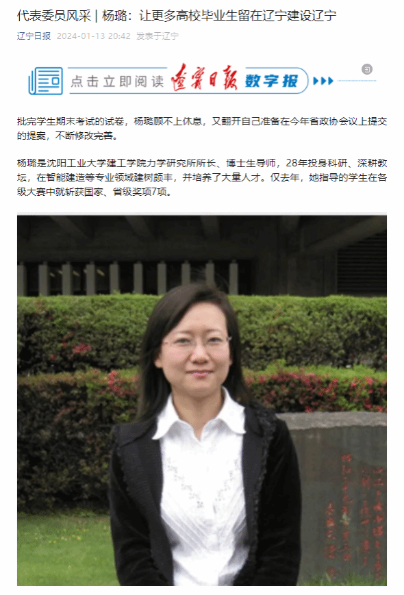 教师、科研工作者、政协委员等身份的叠加,让杨璐对“如何将教育优势转化为振兴发展优势”有了更深刻、更全面的思考,促使她在准备今年的提案时,将重点聚焦在培育高质量人才、让青年人才在辽宁落地生根上。“为的就是让更多高校毕业生能够留在辽宁、建设辽宁,为辽宁全面振兴提供人才支撑和智力支撑。”杨璐说。