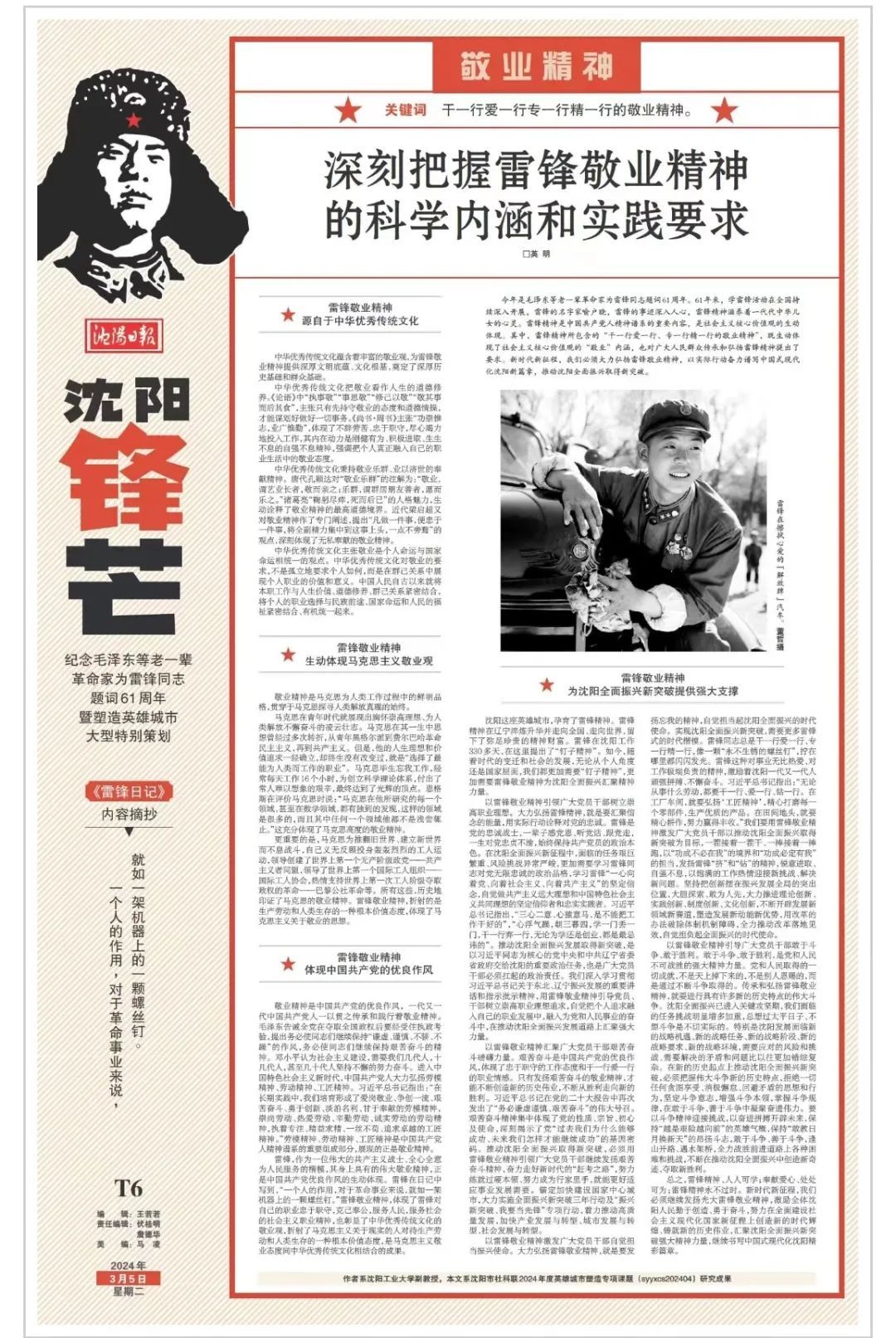 今年是毛泽东等老一辈革命家为雷锋同志题词61周年。61年来,学雷锋活动在全国持续深入开展,雷锋的名字家喻户晓,雷锋的事迹深入人心,雷锋精神滋养着一代代中华儿女的心灵。雷锋精神是中国共产党人精神谱系的重要内容,是社会主义核心价值观的生动体现。其中,雷锋精神所包含的“干一行爱一行、专一行精一行的敬业精神”,既生动体现了社会主义核心价值观的“敬业”内涵,也对广大人民群众传承和弘扬雷锋精神提出了要求。新时代新征程,我们必须大力弘扬雷锋敬业精神,以实际行动奋力谱写中国式现代化沈阳新篇章,推动沈阳全面振兴取得新突破。