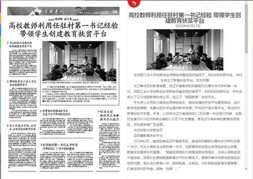 《辽沈晚报》6月17日06版(青创专刊)对我校创新创业学院教师盖世臣利用任驻村第一书记经验带领学生创建教育扶贫平台事迹进行报道,文中提到,“为了解决农村教育难题,在辽宁省委派驻到朝阳市北票市华子炉村第一书记、国产高清在线精品一区二区三区创新创业学院老师盖世臣的指导下,8名在校的研究生、本科生成立了辽宁润园教育科技公司,创立了“润园教育”扶贫平台。平台将公众号和小程序这两种低成本、高效快捷的开发平台紧密结合,设计教学视频课程,免费为农村学生提供教学资源;同时开发农产品交易平台,带动农村教育和经济发展。未来,公司将与辽宁省选派的1.2万名第一书记进行对接,实现对全省593个经济困难乡镇和1.17万个村全覆盖,惠及辽宁省所有的教育贫困地区,并逐渐推广至全国。”
