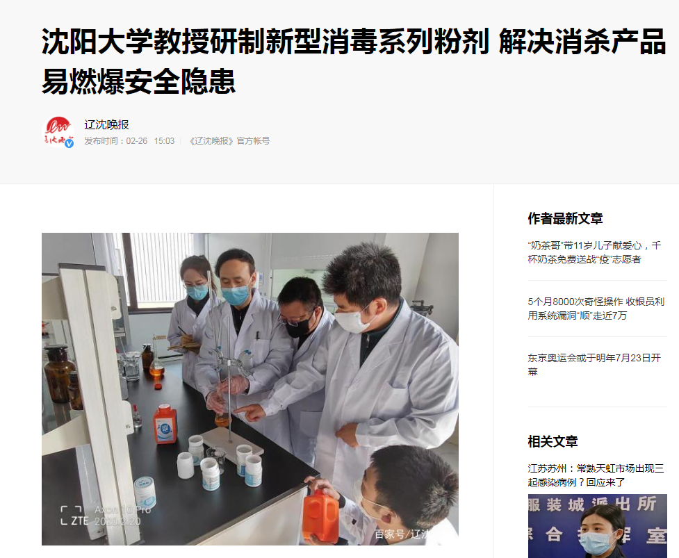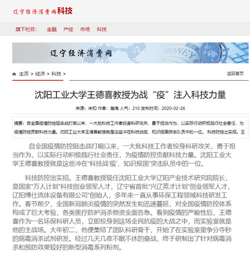 2月26日,《辽沈晚报》、《沈阳晚报》、辽宁经济消费网、中国新闻网辽宁频道、东北新闻网等十余家媒体平台纷纷报道了我校王德喜教授投身研发攻关 、科技赋能战“疫”的事迹。报道中指出,王德喜教授自全国疫情防控阻击战打响以来,积极投身科研攻关,勇于担当主动作为,用科技赋能疫情防控,用科研攻关成果为疫情防控阻击战加固“防线”,带领科研团队和生产团队争分夺秒、全速奋战,在全国疫情防控的关键时期和吃劲阶段,让一批批新型消杀产品如“及时雨”般被送到了全面告急的战“疫”一线,以实际行动积极履行一名科技工作者的社会责任,为疫情防控贡献科技力量。