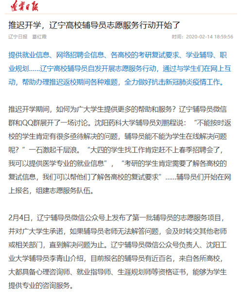2月14日,《辽宁日报》、搜狐网、爱思教育等多家媒体平台以“推迟开学,辽宁高校辅导员志愿服务行动开始了”为题,报道了辽宁高校辅导员自发开展志愿服务行动,为学生提供就业信息、网络招聘会信息,传达各高校的考研复试要求,开展学业辅导、职业规划指导等服务。报道中指出,我校建筑与土木工程学院副院长李青山,作为辽宁辅导员微信公众号负责人,介绍了辽宁辅导员微信公众号在发布了第一批辅导员的志愿服务项目后,各高校辅导员纷纷踊跃报名,为学生提供专业的咨询服务等情况。同时,文中还报道了我校召开辅导员线上会议,建立在线咨询志愿服务,开办线上“就业工作移动办公室”,对就业政策咨询、就业手续办理、校园招聘等工作改为网络、电话等无接触工作模式等工作。