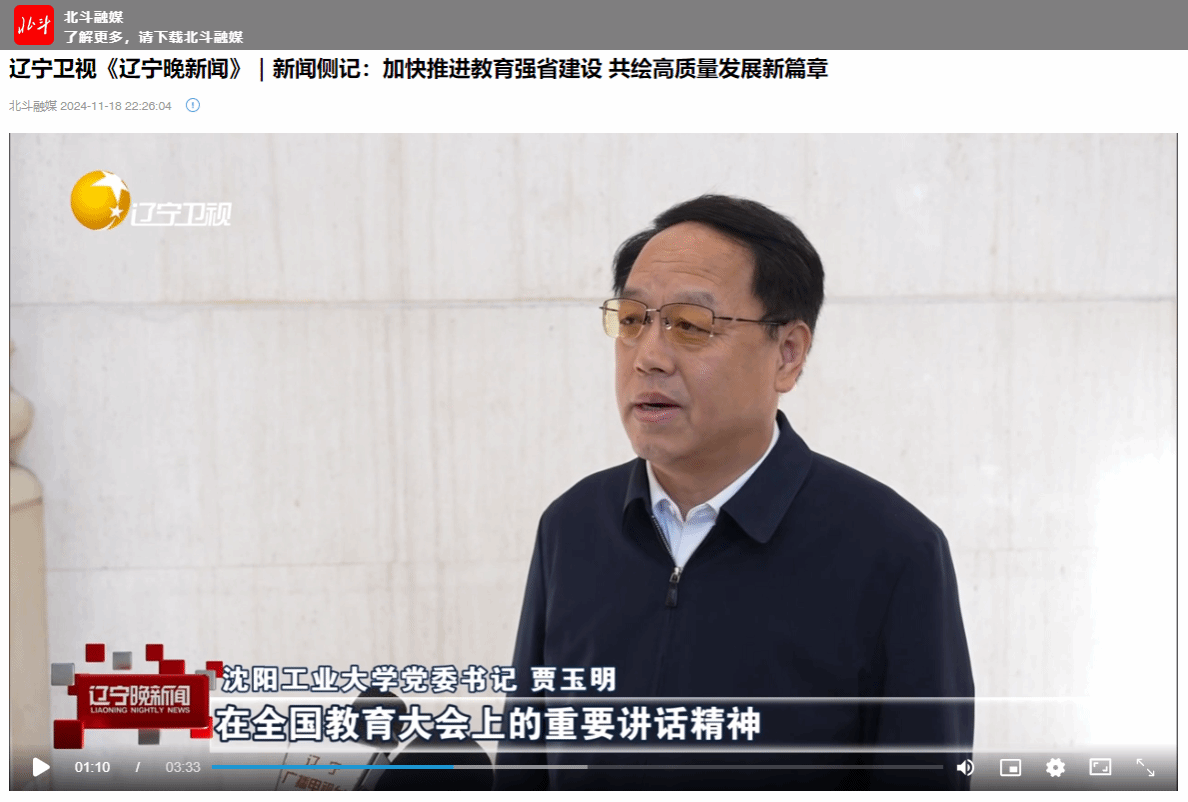 11月18日,全省教育大会在沈阳召开。我校党委书记贾玉明在会后接受采访,他表示,应切实将教育优势转化为振兴发展优势,将努力建立科技创新与人才培养相互支撑、带动学科高质量发展的有效机制,为辽宁全面振兴提供人才和智力支持。辽宁日报、北斗融媒等媒体平台进行相关报道。