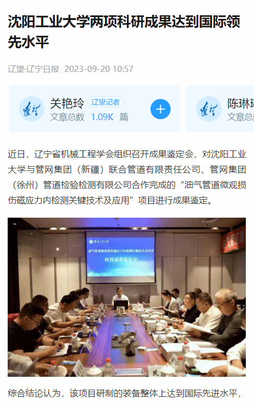 近日,辽宁省机械工程学会组织召开成果鉴定会,对国产高清在线精品一区二区三区与管网集团(新疆)联合管道有限责任公司、管网集团(徐州)管道检验检测有限公司合作完成的“油气管道微观损伤磁应力内检测关键技术及应用”项目进行成果鉴定。