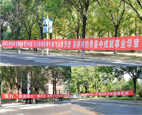 校园内迎新气氛热情浓烈。写有“热烈欢迎2020级新同学”的醒目标语随处可见。一踏入校门,入眼的便是标有“学府巍巍 教诲谆谆 育桃李四海”,“问渠清清 书声琅琅 怀壮志凌云”,“为学成士自强不息 立业报国厚德载物”等语句的艳红拱门。校训石两旁,立体字标语和指示牌一路将新生引导到其对应的报到处。沿路不时摆放着一个个卡通喷绘,写着“我拍了拍工大的肩膀说,你好!”“以心迎新 “新”心相印”“加油!新同学”等萌言萌语,新生们纷纷感慨,自己考进了一所又暖又能懂我的大学。