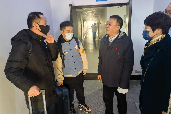 在C5、C6、C7宿舍楼,党委书记贾玉明亲切看望返校同学和楼内志愿者同学,情真意切地与同学们唠家常、谈感受、话未来。在与学生的交流中,他充分肯定了工大学子昂扬向上的精神面貌和自强笃行的精神品质,尤其是在去年年末学校面对突发困难时,同学们表现出的乐观、坚韧、团结、勇敢,迸发出的强大青春力量,让学校为之赞叹。站在新学期的起点,他叮嘱同学们要注意身体、适度锻炼,做自己健康第一责任人,勉励同学们要厚植家国情怀、涵养进取品格,刻苦钻研、精进学业,要牢记习近平总书记嘱托,坚定不移听党话、跟党走,怀抱梦想又脚踏实地,敢想敢为又善作善成,立志做有理想、敢担当、能吃苦、肯奋斗的新时代好青年。