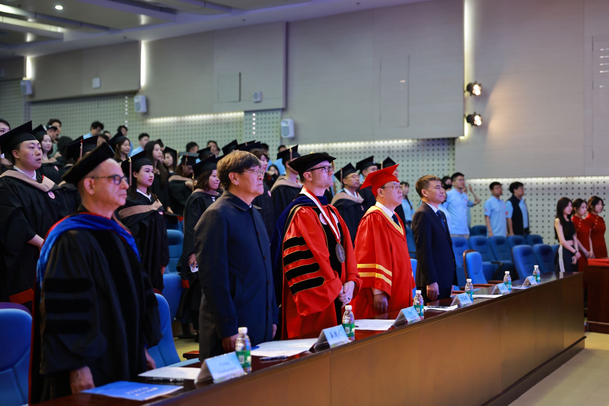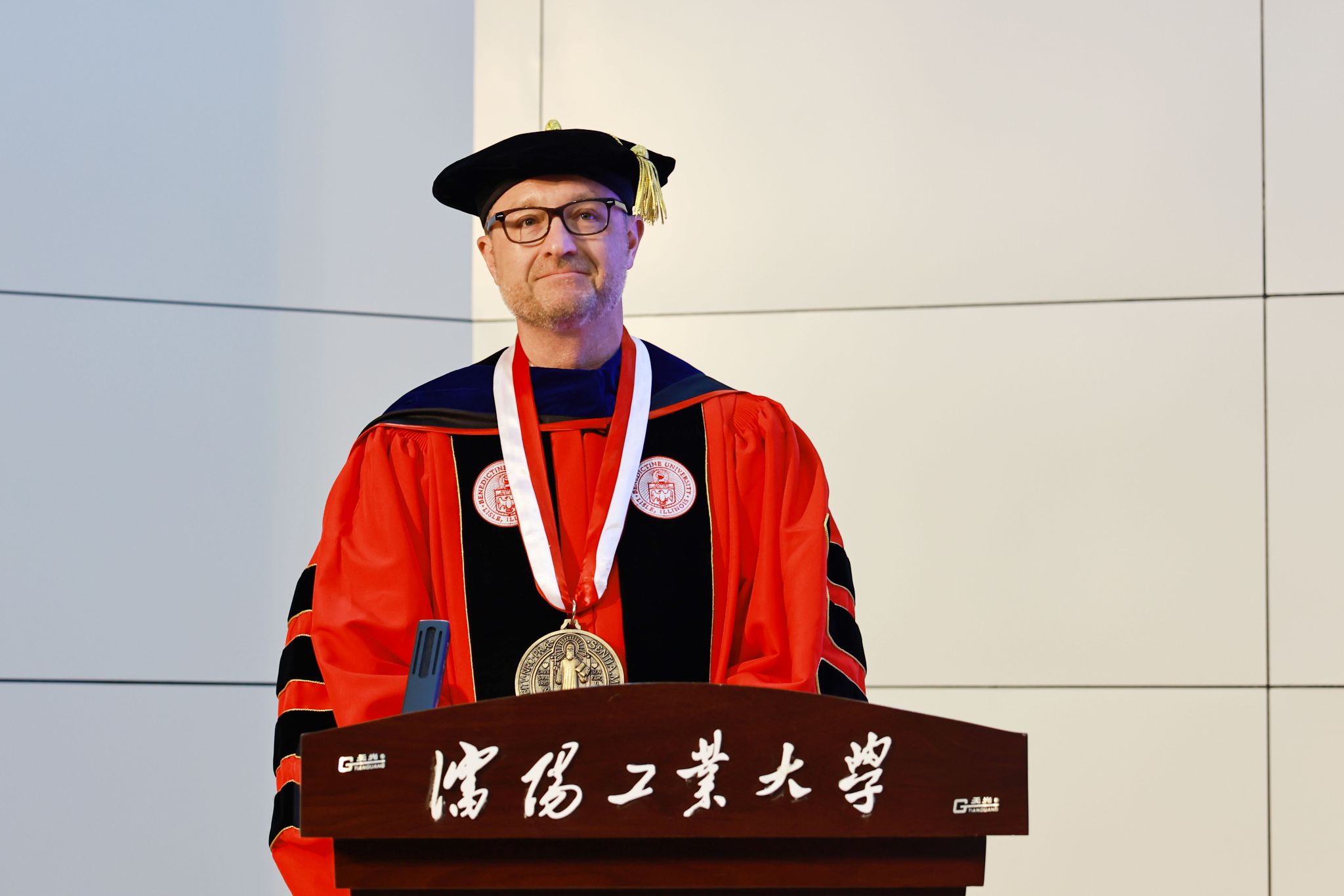 福伊教授向全体毕业生表达了衷心的祝贺,向一直以来在背后默默付出、给予支持的老师和家长表示由衷的感谢。他对同学们跨越文化界限进行学习交流,所具备的适应能力和勇气表示肯定。他表示,同学们是创新的使者,是文化之间的桥梁,很高兴见证大家通过辛勤努力取得卓越成就。他鼓励同学们要开拓全球化视野,在世界舞台上崭露头角,成为引领行业发展的领导者。